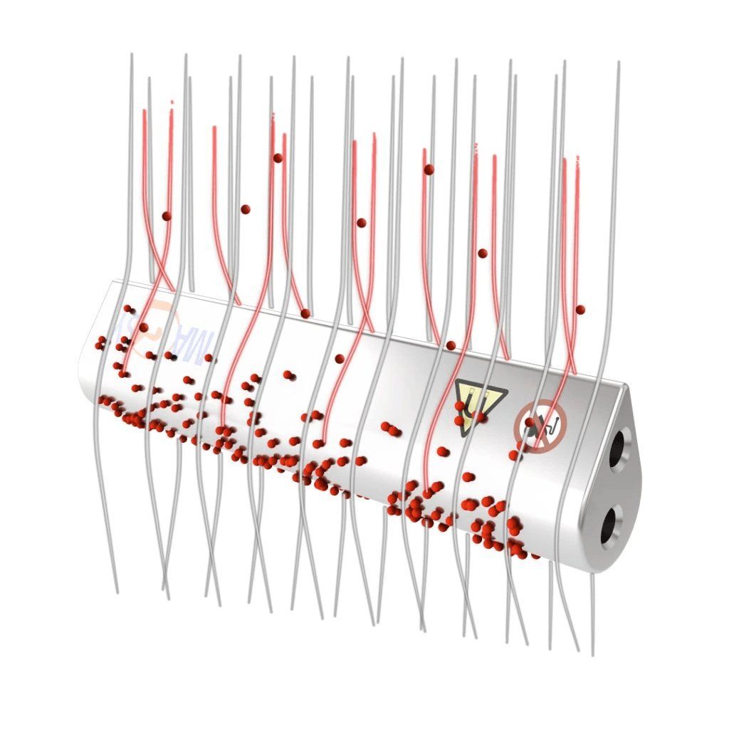 Magnetstäbe sind so konstruiert, dass sie möglichst viele metallische magnetische Verunreinigungen erfassen. Alles hängt jedoch von der Menge dieser magnetischen Verunreinigungen ab, die in Ihrem Material vorkommt. Es ist nicht möglich, die Erfassung aller magnetischen Verunreinigungen verbindlich zu garantieren. Es ist immer notwendig, die konkrete Technologie und Kapazitäten zu berücksichtigen. Bei Bedarf müssen weitere Arten der magnetischen Separation vorgeschaltet oder ergänzt werden. Verlassen Sie sich bitte nicht nur auf diesen einen Magnetstab. Falls Sie Beratung benötigen, wenden Sie sich jederzeit an unsere Experten im Bereich der magnetischen Separation.