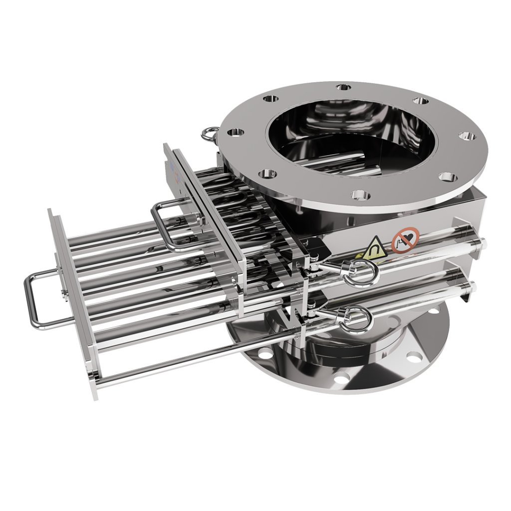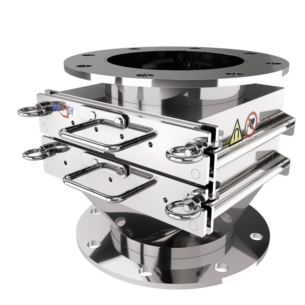 Ein Magnetabscheider, der ausschließlich für den industriellen Einsatz bestimmt ist, sorgt für eine perfekte Reinigung Ihrer trockenen Mischungen von ferromagnetischen Verunreinigungen (unter ferromagnetischen Verunreinigungen verstehen wir vollständig magnetische Metalle wie Eisen, Nickel, Kobalt sowie eisenhaltige Legierungen – nicht paramagnetische, sehr schwach magnetische Materialien).