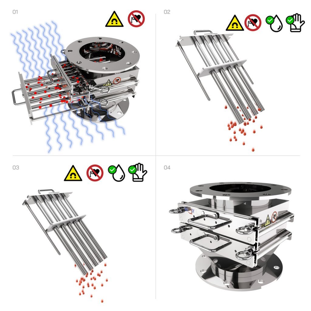 Die Magnetgitter im Magnetabscheider sind so konstruiert, dass sie möglichst viele metallische magnetische Verunreinigungen erfassen. Alles hängt jedoch von der Menge dieser magnetischen Verunreinigungen ab, die in Ihrem Material vorkommen. Es ist nicht möglich, verbindlich zu garantieren, dass alle ferromagnetischen Verunreinigungen erfasst werden. Es ist stets die konkrete Technologie und die Kapazitäten zu berücksichtigen. Bei Bedarf sind weitere Arten der magnetischen Separation vorzuschalten oder zu ergänzen. Bitte verlassen Sie sich nicht ausschließlich auf diesen einen Magnetabscheider. Wenn Sie sich nicht sicher sind, verwenden Sie diesen Typ Magnetabscheider nicht und wenden Sie sich jederzeit an unsere Experten im Bereich der magnetischen Separation.
