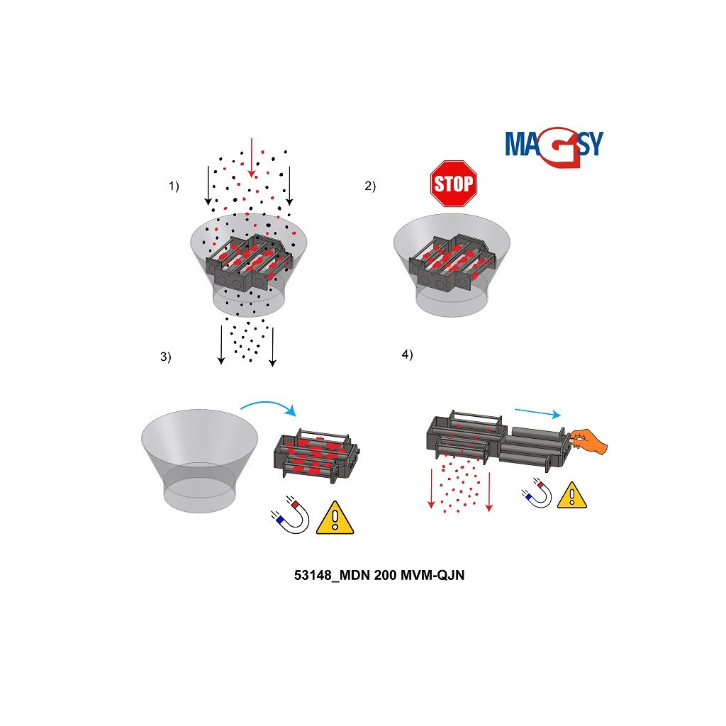 Dieser Magnet nimmt (trennt) metallische ferromagnetische Partikel von 1 µm und kleiner (charakteristischer ferromagnetischer, unmessbarer, magnetischer Staub) bis zu einer Größe von 3 mm (3x3x3 mm) auf, was die maximale Fraktion (Größe) des Materials ist, das auf den Magneten in den Trichter fallen und über ihn geschüttet werden kann. In seltenen Fällen kann dieser Magnet auch größere Metallgegenstände bis zu 5 mm (5x5x5 mm) im Trichter festhalten. Es wird jedoch davon ausgegangen, dass diese Verunreinigungen zufällig bis zu einem Maximum von 1 % der gesamten Stundenleistung des zu siebenden Materials auftreten (es wird davon ausgegangen, dass der Magnetrost regelmäßig von ferromagnetischen Verunreinigungen gereinigt wird, was nicht bedeutet, dass das gesamte 1 % an größeren, ferromagnetischen Verunreinigungen während der gesamten Zeit der Stundenleistung des zu siebenden Materials auf dem Trichtermagneten verbleiben darf). Der Gehalt an diesen größeren ferromagnetischen Verunreinigungen darf nicht höher sein. Wenn der Anteil dieser größeren ferromagnetischen Verunreinigungen in Ihrem Material höher ist, verwenden Sie diesen Trichtermagneten nicht und wenden Sie sich für eine fachkundige Beratung an unsere Vertriebs- und Technikabteilung.