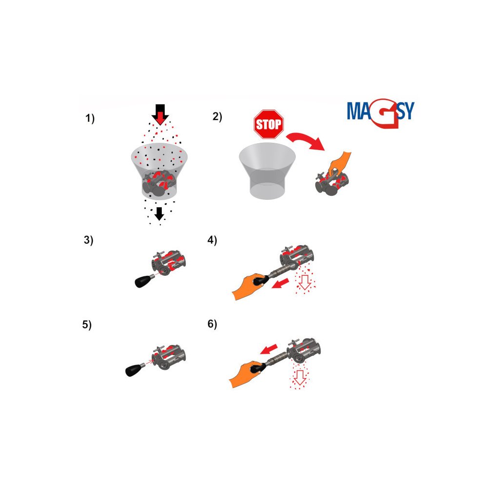 Seien Sie beim Reinigen des Magneten im Trichter sehr vorsichtig, die Magnetkerne sind sehr stark und das Anbringen an Metallgegenständen kann zu Quetschungen führen. Nicht auf magnetische Gegenstände stellen (Tische, Ponks, Treppen, Böden...).