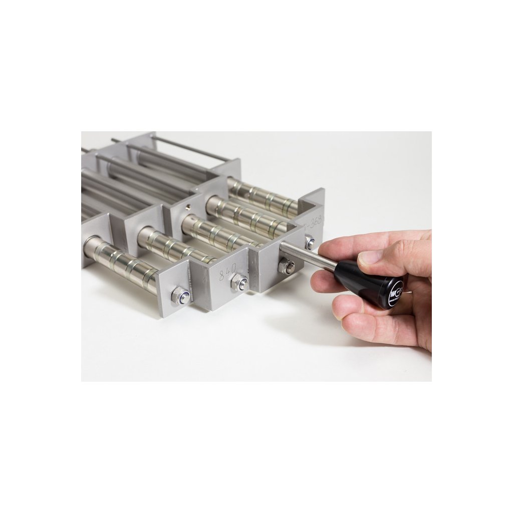 Der Trichtermagnet wird als Vorstufe zur Technologie eingesetzt, um zu verhindern, dass ferromagnetische Metallverunreinigungen in die Geräte gelangen und diese beschädigen, wie z. B. Mühlenmesser, Brecher, Düsen von Regranulier- und Granulieranlagen, Spritzgießdüsen, Strangpressen, Pressen, Abwrackanlagen, Feinsiebe, Keramikpressen, Glaspressen usw. Überall dort, wo Material vor der Technologie in einem Trichter gesammelt wird. Er kann auch dazu verwendet werden, das Gemisch bis zur höchstmöglichen Reinheit zu reinigen, wobei der Rost am Ende des Produktionsprozesses kurz vor der Verpackung, dem Versand, platziert wird, so dass es bei weiteren Vorgängen in der Produktionsanlage (z. B. bei der manuellen Verpackung von Produkten durch Hilfstrichter) keine Verunreinigung mit metallischem ferromagnetischem Material mehr gibt. In diesem Fall wird erwartet, dass das gereinigte Material sofort in wiederverschließbare Behälter oder in andere wiederverschließbare Behälter eingeschlossen wird. Dank des perfekt konzipierten Magnetkreises und des durch den sich ausdehnenden Rundstahl geschaffenen Sieblabyrinths wird eine hohe Erfassung von ferromagnetischen Verunreinigungen erreicht (lesen Sie bitte weiter unten im Detail die Beschreibung, welche ferromagnetischen metallischen Verunreinigungen durch dieses Magnetgitter erfasst werden können).