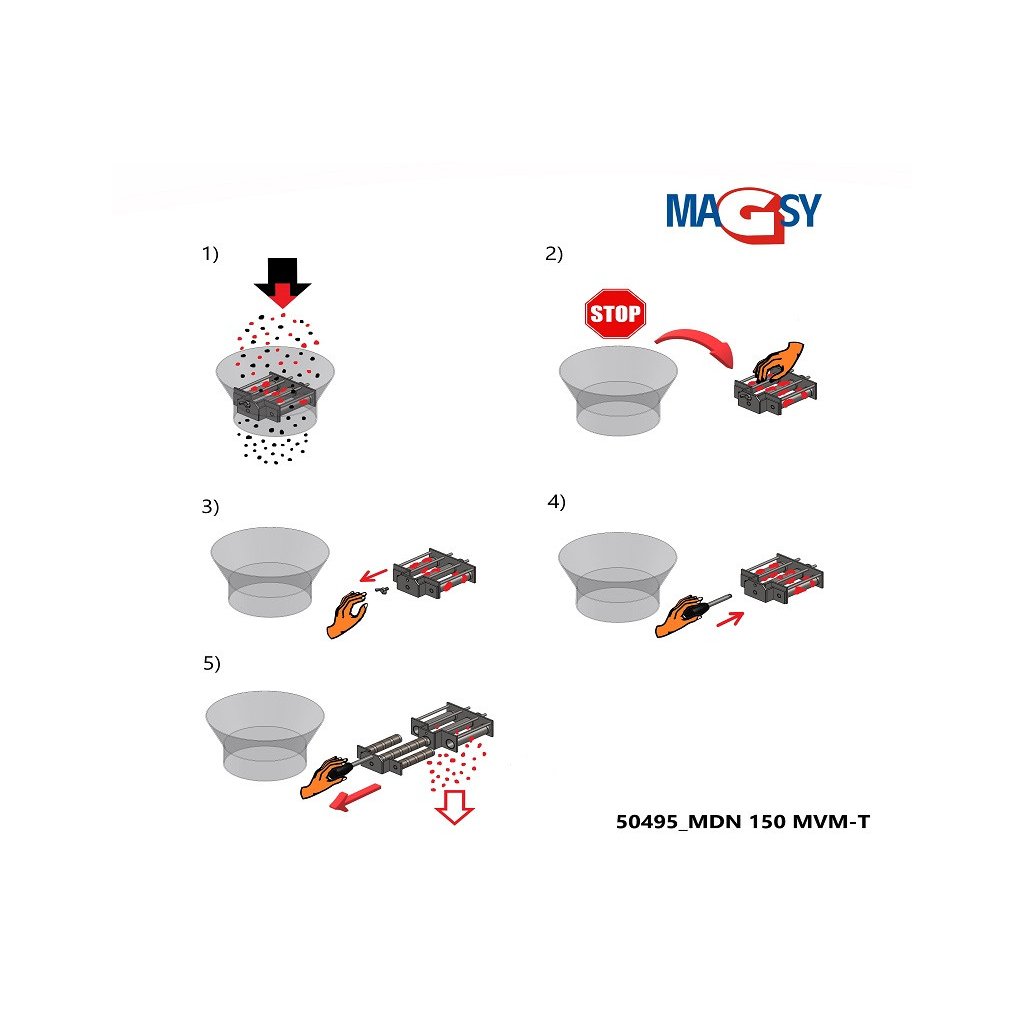 Der Trichtermagnet ist weder für die magnetische Trennung von nichtmagnetischen, nichtferromagnetischen Metallen noch für die magnetische Trennung von Teilen oder Teilen, die ferromagnetische Metalle enthalten (z.B. Kunststoffteile mit eingepressten Metallteilen, zerkleinerte Fensterrahmen mit Metallstreifenresten, Holzpellets mit eingepressten feinen Drähten...), vorgesehen. Falls Sie solche ferromagnetischen Verunreinigungen abtrennen müssen, verwenden Sie diesen Magneten nicht im Trichter und wenden Sie sich an unsere Experten für Magnetabscheidung, die Sie beraten werden, welchen anderen Magnetabscheider Sie verwenden oder welchen Typ Sie zu Ihrer Abscheideanlage hinzufügen sollten.