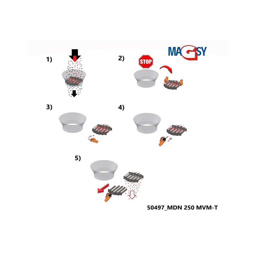 Dieser Magnet nimmt (trennt) metallische ferromagnetische Partikel von 1 µm und kleiner (charakteristischer ferromagnetischer, unmessbarer, magnetischer Staub) bis zu einer Größe von 3 mm (3x3x3 mm) auf, was die maximale Fraktion (Größe) des Materials ist, das auf den Magneten in den Trichter fallen und über ihn geschüttet werden kann. In seltenen Fällen kann dieser Magnet auch größere Metallgegenstände bis zu 5 mm (5x5x5 mm) im Trichter festhalten. Es wird jedoch davon ausgegangen, dass diese Verunreinigungen zufällig bis zu einem Maximum von 1 % der gesamten Stundenleistung des zu siebenden Materials auftreten (es wird davon ausgegangen, dass der Magnetrost regelmäßig von ferromagnetischen Verunreinigungen gereinigt wird, was nicht bedeutet, dass das gesamte 1 % an größeren, ferromagnetischen Verunreinigungen während der gesamten Zeit der Stundenleistung des zu siebenden Materials auf dem Trichtermagneten verbleiben darf). Der Gehalt an diesen größeren ferromagnetischen Verunreinigungen darf nicht höher sein. Wenn der Anteil dieser größeren ferromagnetischen Verunreinigungen in Ihrem Material höher ist, verwenden Sie diesen Trichtermagneten nicht und wenden Sie sich für eine fachkundige Beratung an unsere Vertriebs- und Technikabteilung.