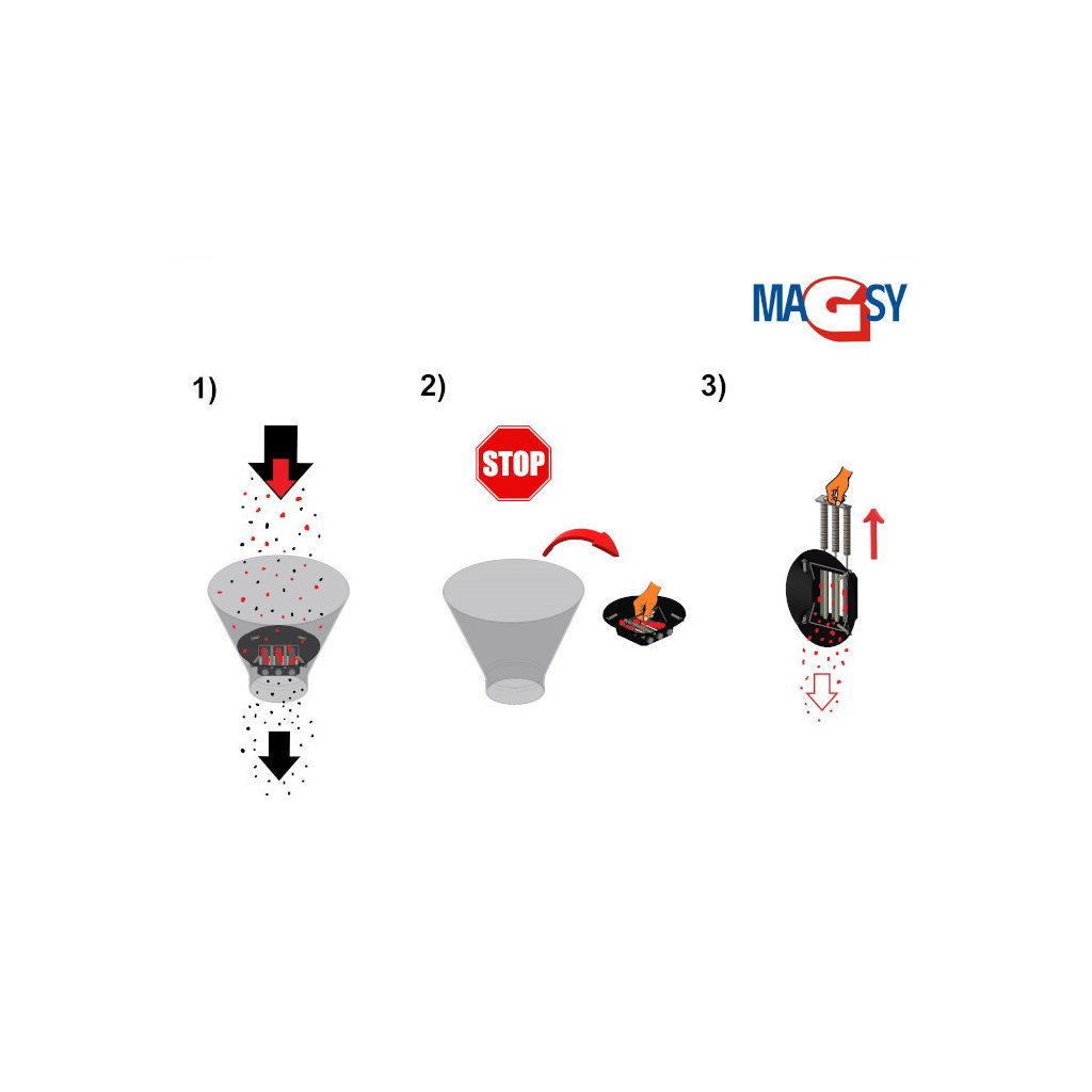 Das Magnetgitter wird zum Schutz der Technologie (Spritzgießen) verwendet, damit metallische, ferromagnetische Verunreinigungen nicht in die Einspritzdüsen gelangen und so Verstopfungen und Schäden verhindern. Es kann auch verwendet werden, um das Gemisch bis zur höchstmöglichen Sauberkeit zu reinigen, wenn das Gitter am Ende des Produktionsprozesses kurz vor der Verpackung, dem Versand (nur in konische Trichter legen und nur für Kunststoffgranulate, Regranulate, Krümel verwenden), so dass es keine Kontamination mit metallisch-ferromagnetischem Material während der weiteren Operationen in der Produktionsanlage mehr gibt. In diesem Fall ist eine sofortige Einschließung des gereinigten Materials in verschließbare Behälter oder in andere verschließbare Behälter vorgesehen. Dank des gut konzipierten Magnetkreises und der Labyrinthrutsche wird eine hohe Abscheidung von ferromagnetischen Verunreinigungen erreicht (lesen Sie bitte weiter unten im Detail die Beschreibung, welche ferromagnetischen metallischen Verunreinigungen von diesem Magnetgitter abgeschieden werden können).