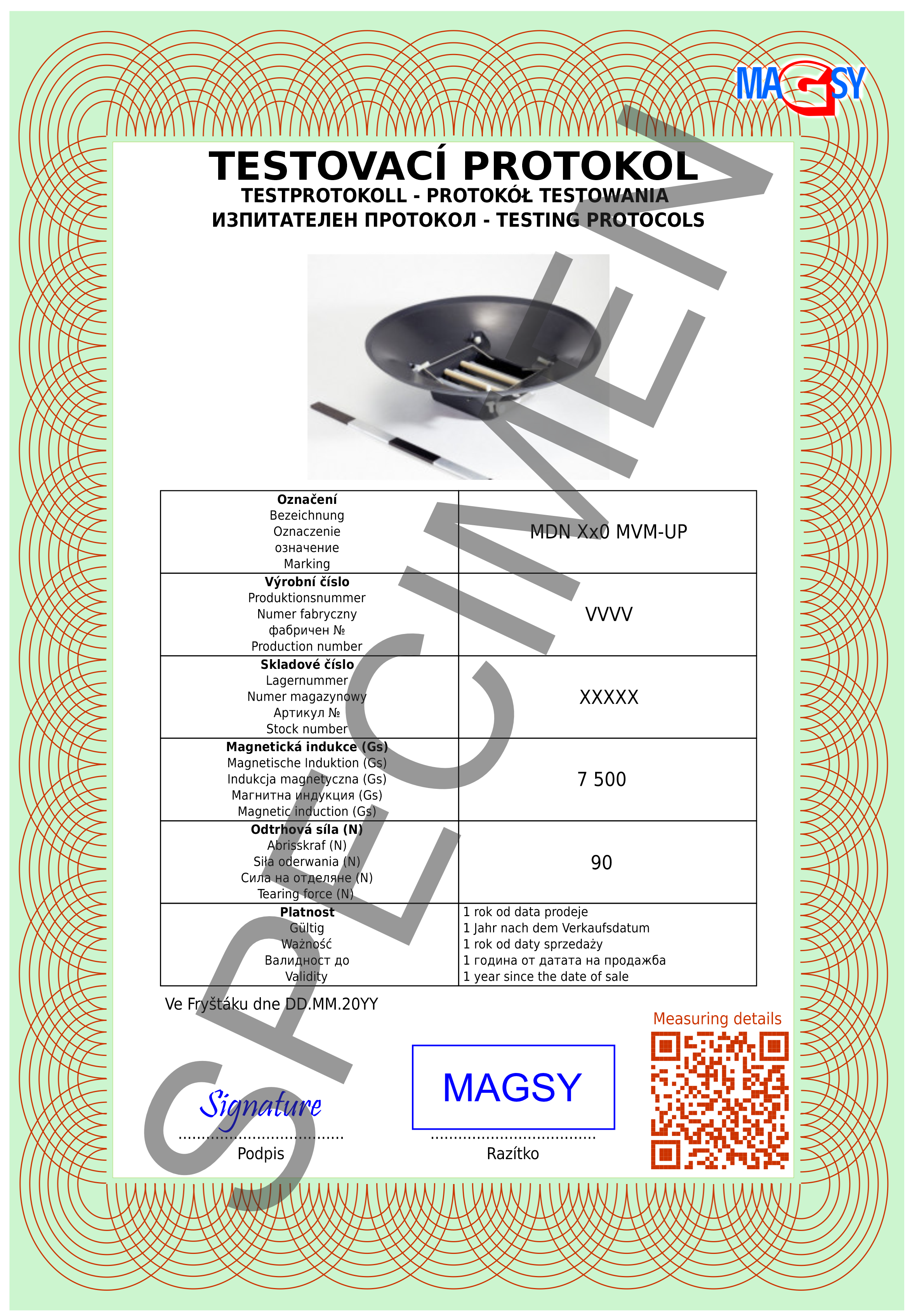 Als Bestätigung der Messung und als Garantie der gemessenen Werte stellen wir für jedes einzelne Stück Magnetabscheider ein originales Messprotokoll aus, das Bestandteil der Lieferung ist und speziell für Ihren konkreten Magnetrost erstellt wird (auf dem Protokoll werden Lager- und Produktionsnummer angegeben).