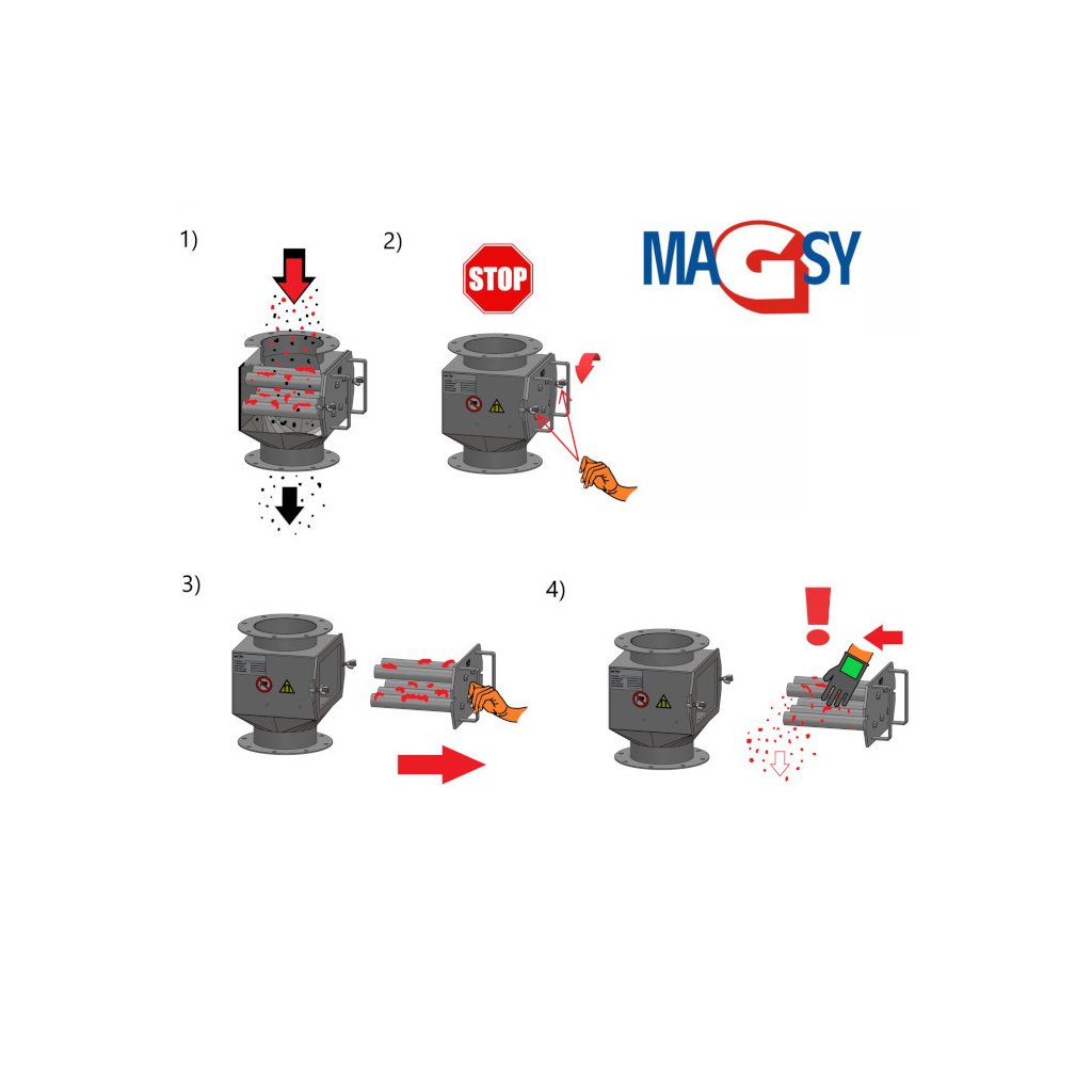 Sein Sie sehr vorsichtig beim Reinigen des Magnetabscheiders, die Magnetgitter und Magnetkerne sind nach dem Entfernen sehr stark und das Anbringen an metallischen Gegenständen kann zu Quetschungen und Druckverletzungen führen. Legen Sie sie nicht auf magnetische Gegenstände (Tische, Ponks, Treppen, Böden...). Achten Sie auch darauf, dass die einzelnen Komponenten des Magnetabscheiders bei der Reinigung nicht zusammenkleben.