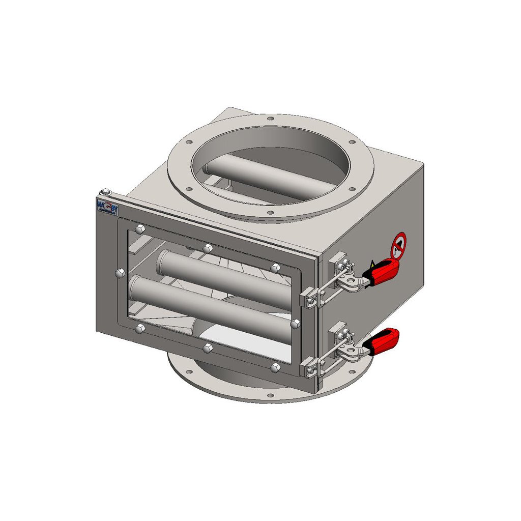Auswerfbarer Magnetabscheider wird als Vorläufer zum Schutz der Technik verwendet, damit ferromagnetische Metallverunreinigungen nicht in Geräte gelangen, die sie beschädigen könnten, wie z. B. Mühlenmesser, Brecher, Düsen von Regranulier- und Granulieranlagen, Spritzgussdüsen, Strangpressen, Pressen, Verschrottungsanlagen, Feinsiebe, Keramikpressen, Glaspressen usw. Es kann auch verwendet werden, um das Gemisch bis zur höchstmöglichen Reinheit zu reinigen, wobei der Abscheider am Ende des Produktionsprozesses kurz vor der Verpackung und dem Versand eingesetzt wird, so dass es bei den nachfolgenden Vorgängen in der Produktionsanlage nicht mehr zu einer Verunreinigung mit metallisch-ferromagnetischem Material kommt. In diesem Fall ist vorgesehen, dass das zu reinigende Material unmittelbar in verschließbaren Behältern oder in anderen verschließbaren Behältern eingeschlossen wird. Aufgrund der hervorragenden Konstruktion des magnetischen Labyrinths, das aus einem Paar übereinanderliegender Gitter besteht, wird eine hohe Schadstofferfassung erreicht (bitte lesen Sie unten eine detaillierte Beschreibung, welche ferromagnetischen metallischen Verunreinigungen dieser Magnetabscheider erfassen kann).