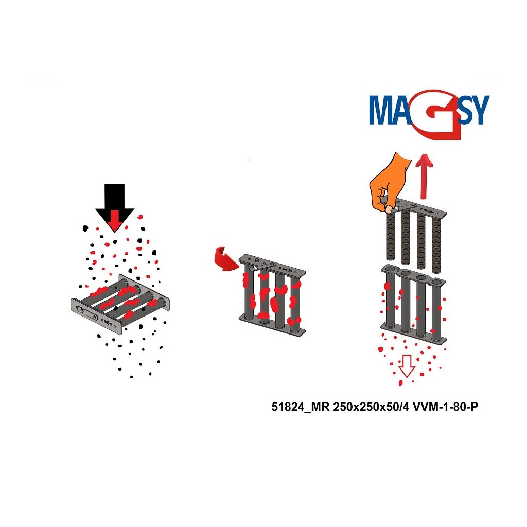 Dieser Magnetrost nimmt ferromagnetische Metallteilchen von 1 µm und kleiner (charakteristischer ferromagnetischer, unmessbarer, magnetischer Staub) bis zu einer Größe von 5 mm (5x5x5 mm) auf (trennt sie ab), was die maximale Fraktion (Größe) des Materials ist, das auf den Magnetrost fallen kann und über den Magnetrost geschüttet werden kann. In seltenen Fällen kann der Magnetrost auch größere Metallgegenstände bis zu einer Größe von 10 mm (10x10x10 mm) auffangen. Es wird jedoch davon ausgegangen, dass das zufällige Auftreten solcher Verunreinigungen maximal 1 % der gesamten Stundenleistung des Siebgutes beträgt (es wird von einer regelmäßigen Reinigung des Magnetrostes von ferromagnetischen Verunreinigungen ausgegangen; dies bedeutet nicht, dass das gesamte 1 % an größeren, ferromagnetischen Verunreinigungen während der gesamten Dauer der Stundenleistung des Siebgutes auf dem Magnetrost verbleiben darf). Der Gehalt an diesen größeren ferromagnetischen Verunreinigungen darf nicht höher sein. Sollte der Anteil dieser größeren ferromagnetischen Verunreinigungen in Ihrem Material höher sein, verwenden Sie diesen Magnetrost nicht und wenden Sie sich für eine fachkundige Beratung an unsere technische Verkaufsabteilung.