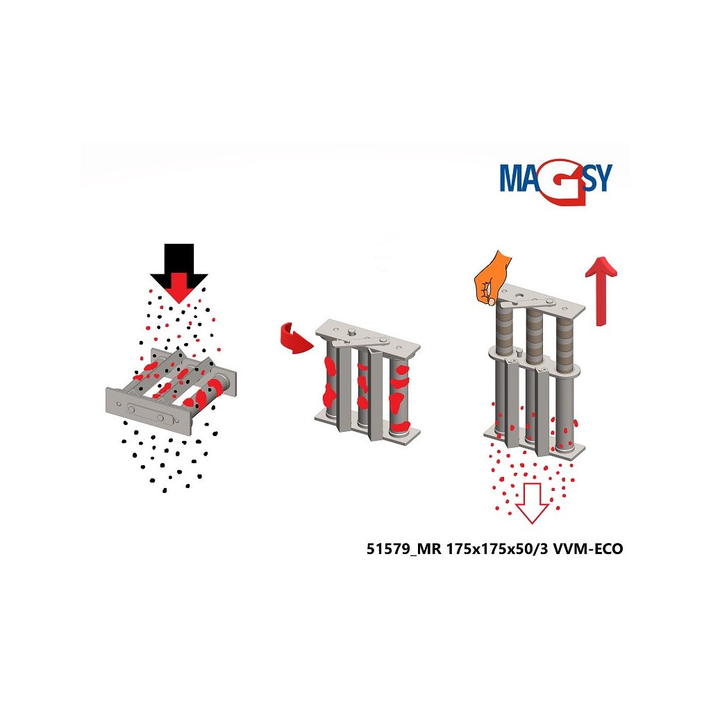 Dieser Magnetrost nimmt ferromagnetische Metallteilchen von 1 µm und kleiner (charakteristischer ferromagnetischer, unmessbarer, magnetischer Staub) bis zu einer Größe von 3 mm (3x3x3 mm) auf (trennt sie ab), was die maximale Fraktion (Größe) des Materials ist, das auf den Magnetrost fallen kann und über den Magnetrost geschüttet werden kann. In seltenen Fällen kann der Magnetrost auch größere Metallgegenstände bis zu einer Größe von 5 mm (5x5x5 mm) auffangen. Es wird jedoch davon ausgegangen, dass das zufällige Auftreten solcher Verunreinigungen maximal 1 % der gesamten Stundenleistung des Siebgutes beträgt (es wird von einer regelmäßigen Reinigung des Magnetrostes von ferromagnetischen Verunreinigungen ausgegangen; dies bedeutet nicht, dass das gesamte 1 % an größeren, ferromagnetischen Verunreinigungen während der gesamten Dauer der Stundenleistung des Siebgutes auf dem Magnetrost verbleiben darf). Der Gehalt an diesen größeren ferromagnetischen Verunreinigungen darf nicht höher sein. Sollte der Anteil dieser größeren ferromagnetischen Verunreinigungen in Ihrem Material höher sein, verwenden Sie diesen Magnetrost nicht und wenden Sie sich für eine fachkundige Beratung an unsere technische Verkaufsabteilung.
