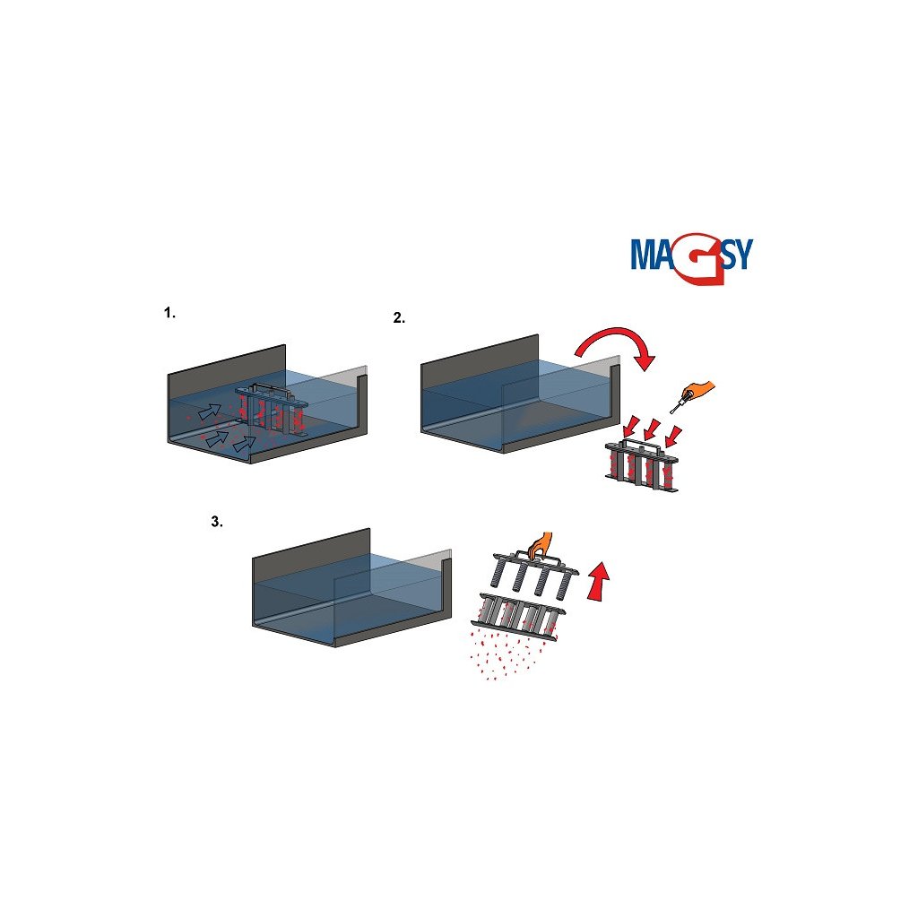 Bitte beachten Sie, dass es nicht möglich ist, bei der Reinigung des Magnetgitters Druckwasser zu verwenden oder die Magnetkerne einzuweichen. Es darf nur ein trockenes Tuch zur Reinigung oder gut getrocknete Druckluft zum Abblasen von Restmetallverschmutzungen und abgelöstem Material verwendet werden. Achten Sie nach der Reinigung der Magnetröhren auf eine einwandfreie Rückdichtung.