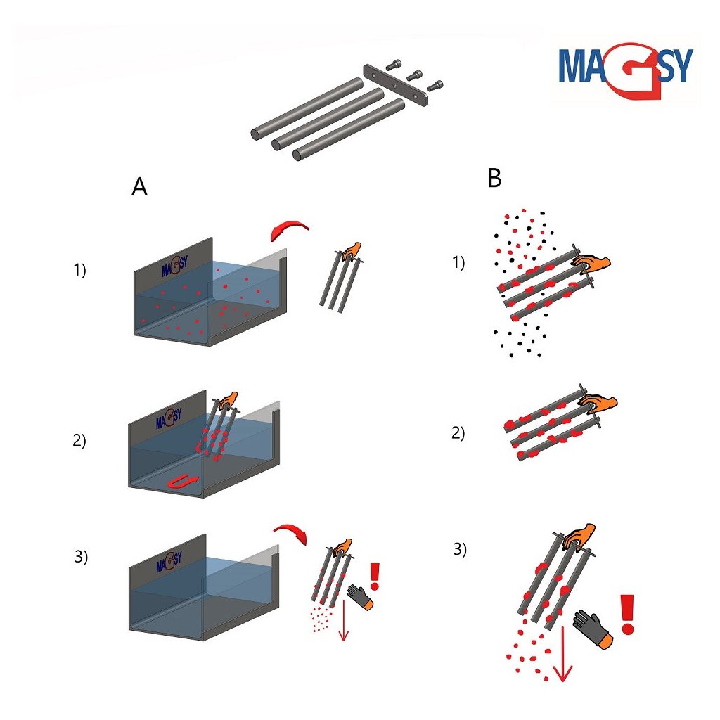 Bitte beachten Sie, dass bei der Reinigung von Magnetstäben Druckwasser nur in einem maximalen Abstand von 300mm zum Magnetstab verwendet werden sollte. Der Magnetstab kann während der Reinigung eingeweicht und abgespült werden (nur mit klarem Wasser). Ebenso können Sie ein trockenes Tuch zum Reinigen oder gut getrocknete Druckluft zum Abblasen von metallischen Schmutzresten und abgelöstem Material verwenden. Beim Abwischen von metallischen magnetischen Verunreinigungen von Hand ist die Verwendung von Arbeitsschutzmitteln erforderlich. Seien Sie vorsichtig, wenn Sie mehrere Magnetstab-Baugruppen reinigen.